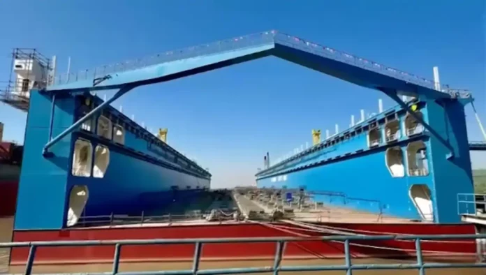 Este dique no es un buque al uso, sino una especie de muelle móvil capaz de levantar barcos enteros fuera del agua para repararlos en seco. Ha sido construido en el astillero Huarun Dadong Dockyard (HRDD), en Shanghái, uno de los centros de referencia de la construcción naval china.