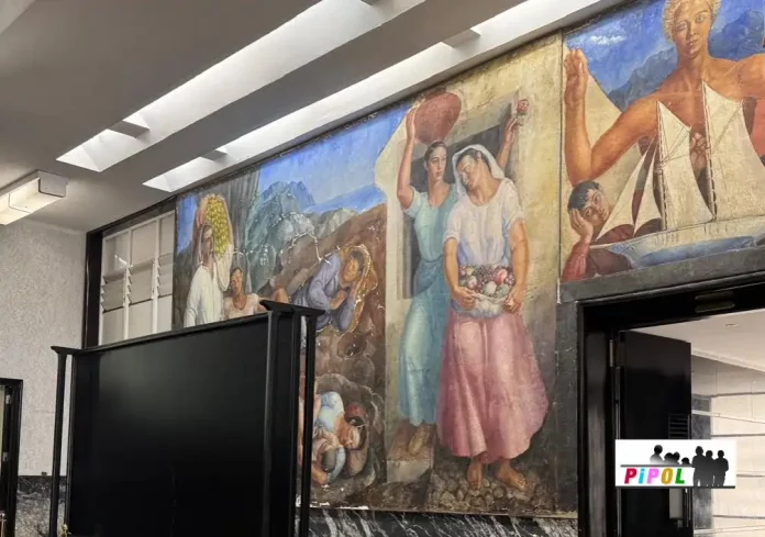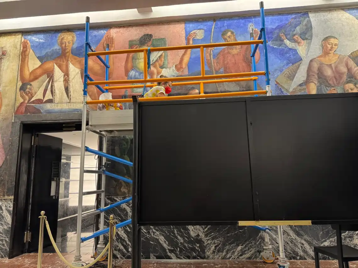 La Fundación Pedro Modesto Campos/Cajasiete y Mutua Tinerfeña, dos entidades locales, costean la restauración de los murales de Aguiar, en el salón de entrada del Real Casino de Tenerife, una genuina construcción art-decó, al más puro estilo de este movimiento que un día conquistó culturalmente al mundo. Hasta el viejo reloj de pared funciona al segundo en esta sociedad, que ayer visité. Los trabajos en los murales estarán terminados este mes y ya se pueden observar los cambios en los deteriorados frescos, que ahora lucirán en todo su esplendor.