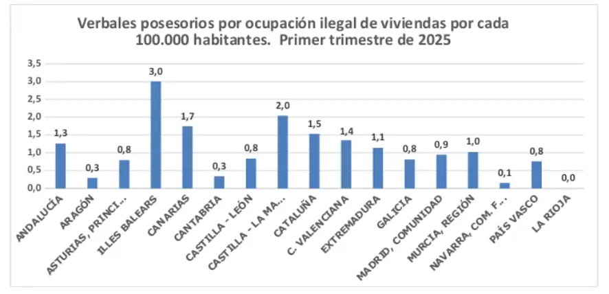 Por último, los procedimientos verbales posesorios por ocupación ilegal de vivienda crecieron un 44% en Canarias durante el invierno pasado: de 27 casos entre enero y marzo de 2024 se pasó a 39 en el mismo periodo de este año. La tasa es de 1,7 procesos por ocupación ilegal de viviendas por cada 100.000 habitantes.