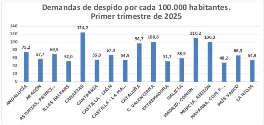 Los procedimientos por despido registrados en los juzgados de Canarias durante el primer trimestre de 2025 crecieron un 8,3% con respecto al mismo periodo del año anterior (de 2.567 en el invierno de 2024 a 2.780 en el de 2025), siendo el incremento en la media del Estado del 3,1%. Las Islas registraron en este periodo la mayor tasa de demandas por despido por cada 100.000 habitantes del país: 124,2, 14 puntos por encima de la segunda, Madrid (110,2). La tasa media nacional fue de 84,6.