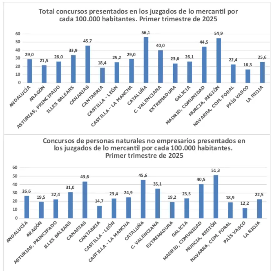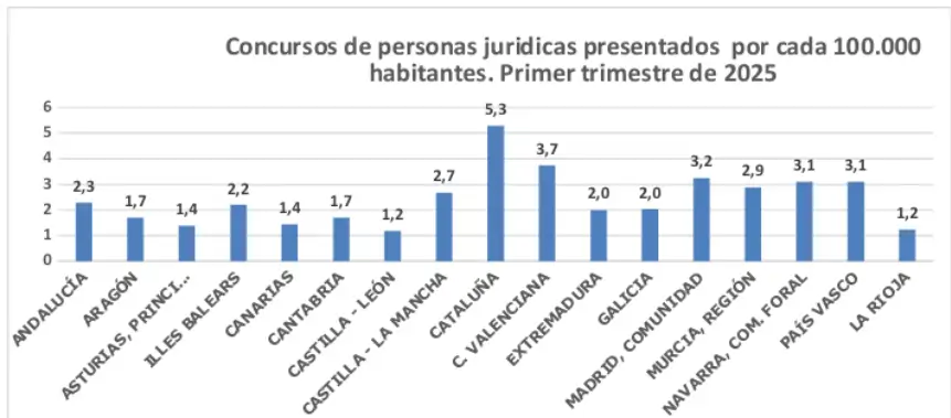 Respecto a los concursos de personas jurídicas, durante el primer trimestre de 2025 se presentaron 1.455, cifra muy cercana a la del mismo trimestre del año anterior al suponer un 0,2 % menos. Cataluña fue el territorio donde se registraron más concursos de personas jurídicas: 423, lo que supone el 29,07 % del total. Le siguieron Madrid, con 227; Andalucía, con 201 y la Comunidad Valenciana, con 199.