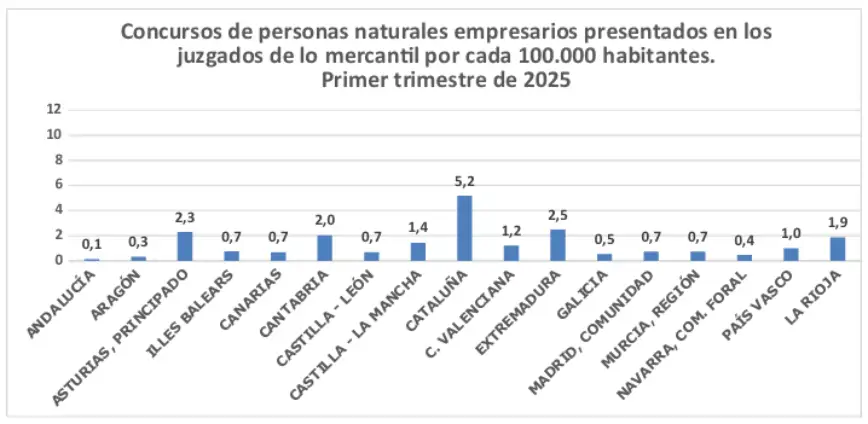 Los concursos presentados por personas naturales no empresarios, 15.833, mostraron un incremento del 44 % respecto al mismo trimestre de 2024. Cataluña encabeza la lista con 3.656 concursos presentados, que representan el 23,09 % del total nacional. Le siguieron Madrid, con 2.839; Andalucía, con 2.338 y la Comunidad Valenciana, con 1.866.