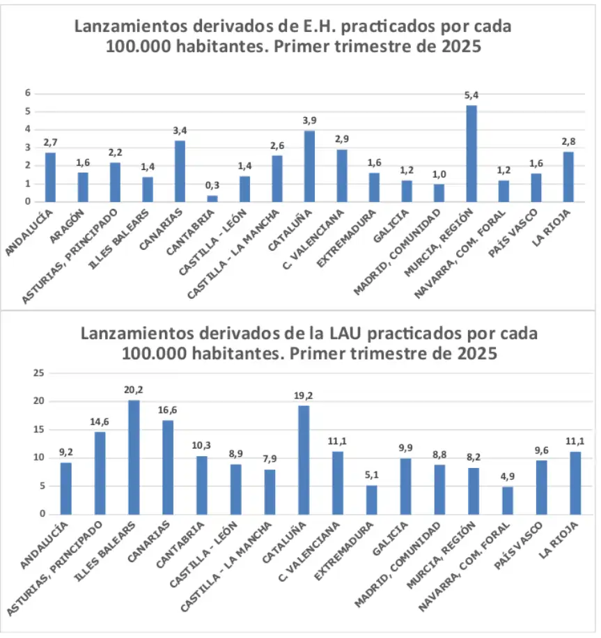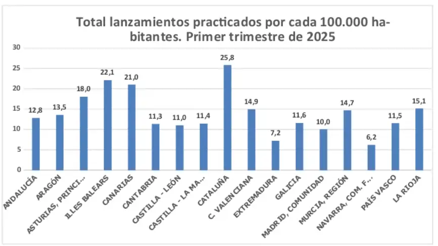 Entre el 1 de enero y el 31 de marzo de este año se practicaron un total de 7.334 lanzamientos, cifra que supone una leve disminución, del 1,2 por ciento, respecto al mismo periodo de 2024. Cataluña –con 2.069, el 28,2 % del total nacional- ha sido la Comunidad Autónoma en la que se practicaron el mayor número de lanzamientos, seguida por Andalucía, con 1.125; la Comunidad Valenciana, con 794 y Madrid, con 702.