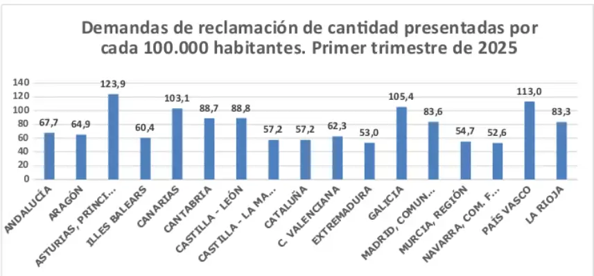 El número de demandas por reclamaciones de cantidad registradas en los Juzgados de lo Social, en total 36.146, fue un 1,3 % superior al presentado en el primer trimestre de 2024. De ellas, 5.954 se registraron en Andalucía, el 16,47 % del total; 5.857 en Madrid, 4.579 en Cataluña y 3.312 en la Comunidad Valenciana.