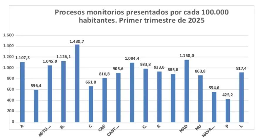 Los procedimientos monitorios presentados en el primer trimestre de 2025 en los Juzgados de Primera Instancia y de Primera Instancia e Instrucción fueron 488.518, lo que supone un importante aumento interanual situado en el 64,6 por ciento. La mayor utilización de este tipo de procedimiento se dio en Andalucía, con 97.450; Cataluña, con 87.684; Madrid, con 80.608 y la Comunidad Valenciana, con 52.333.