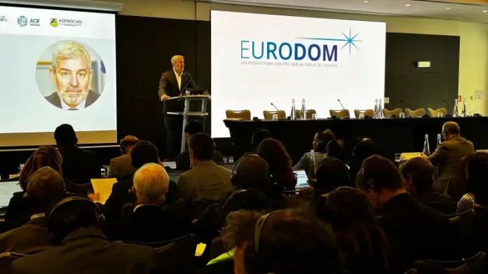El titular del Gobierno autonómico intervino en el acto organizado por Eurodom en dos ocasiones. En primer lugar, abrió la jornada de movilización hablando en nombre de las nueve regiones ultraperiféricas amparadas por el artículo 349 del Tratado de la UE: Canarias, Azores, Madeira, Guadalupe, Martinica, Guayana Francesa, Reunión y Mayotte.