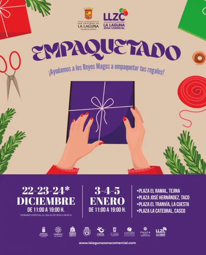 El Ayuntamiento de La Laguna, a través del área de Comercio del que dirige Estefanía Díaz, pone en marcha una nueva edición del servicio gratuito de empaquetado de regalos en distintos distritos del municipio, una iniciativa impulsada por la Asociación Empresarial La Laguna Zona Comercial (LLZC) y FAUCA, que se enmarca dentro de la campaña de Navidad 2025.
