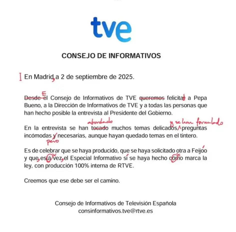 Felicitación del Consejo de Informativos de TVE a Pepa Bueno, con sus correcciones a mano.