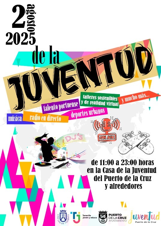 Hoy, en la Casa de la Juventud, se ha presentado el Día de la Juventud 2025, un evento que se celebrará el próximo 2 de agosto desde las 11:00 de la mañana hasta las 11:00 de la noche. Esta jornada promete ser un despliegue sin precedentes, convirtiendo a los jóvenes en los protagonistas absolutos de un programa que combina talleres, deportes urbanos, música en vivo y sesiones de DJ. Diseñado para fomentar la participación, destacar el talento juvenil y promover valores como la inclusión y la sostenibilidad, el evento busca consolidar al Puerto de la Cruz como un referente de creatividad y dinamismo para las nuevas generaciones.