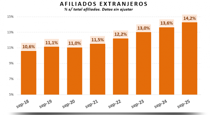 La Seguridad Social ha registrado 3.067.780 afiliados extranjeros en septiembre si se descuenta el efecto calendario. Un mes más, la cifra de trabajadores procedentes de otros países supera los tres millones, tras sumar más de 200.000 ocupados en los últimos doce meses (202.694), lo que supone un +7,07% de variación interanual.