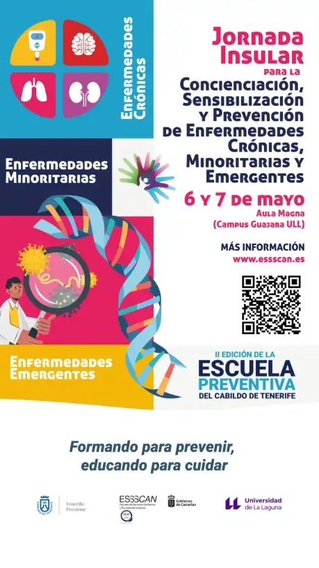 La Escuela de Servicios Sanitarios y Sociales de Canarias (ESSSCAN), adscrita a la Consejería de Sanidad del Gobierno de Canarias, organiza en Tenerife la Jornada Insular para la Concienciación, Sensibilización y Prevención de Enfermedades Crónicas, Minoritarias y Emergentes, que se celebrará los próximos 6 y 7 de mayo en el Aula Magna de la Universidad de La Laguna (ULL).