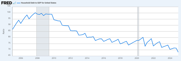 En contraste a la crisis de 2008, el endeudamiento actual no muestra los mismos indicadores de riesgos. En esa crisis, el exceso de deuda en el sector inmobiliario y entre las familias causó una burbuja. Hoy, aunque la deuda nominal ha aumentado, la deuda de los hogares con respecto al PIB nominal se sitúa en un 68,1%, que refleja más solidez que el 100,2% que alcanzó antes de la crisis de 2008, además de que existe una tendencia negativa, que nos indica que la economía crece más rápido que la deuda, y que las familias logran desapalancarse.(Federal Reserve Bank of St. Louis, 2025)