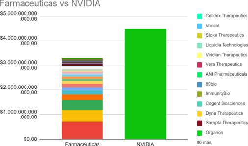Para lograr dimensionar el peso que tiene Nvidia en nuestra sociedad, hemos de entender que la capitalización bursátil, es decir la valoración de la empresa en conjunto, en dólares es de 4,5 trillones americanos (billones europeos). Es decir que tan solo una empresa tiene más capitalización bursátil que el conjunto de empresas farmacéuticas de Estados Unidos que en conjunto suman 3,4 trillones.