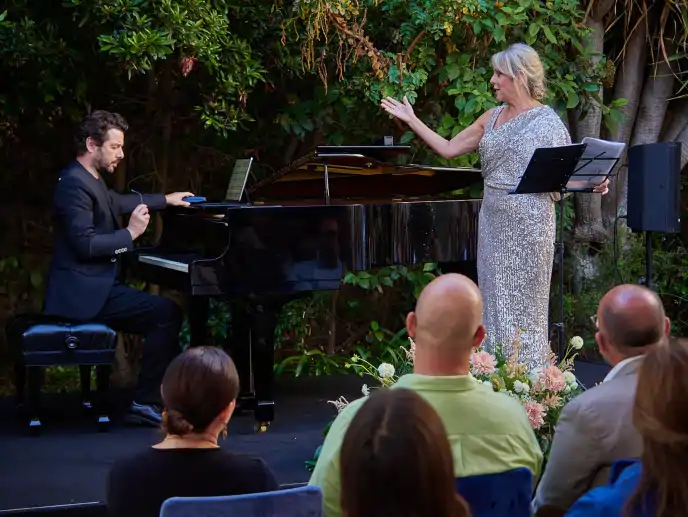 La soprano Carmen Acosta, acompañada al piano por Javier Laso, interpretó el recital ‘Sueño de una noche de verano’, con los fragmentos más destacados del repertorio musical universal, con piezas en italiano, alemán y francés en varios estilos, en los que quedó reflejado el virtuosismo de ambos intérpretes. La cita tuvo una buena acogida, con la asistencia de unas 60 personas que disfrutaron de esta velada en el patio del hotel.