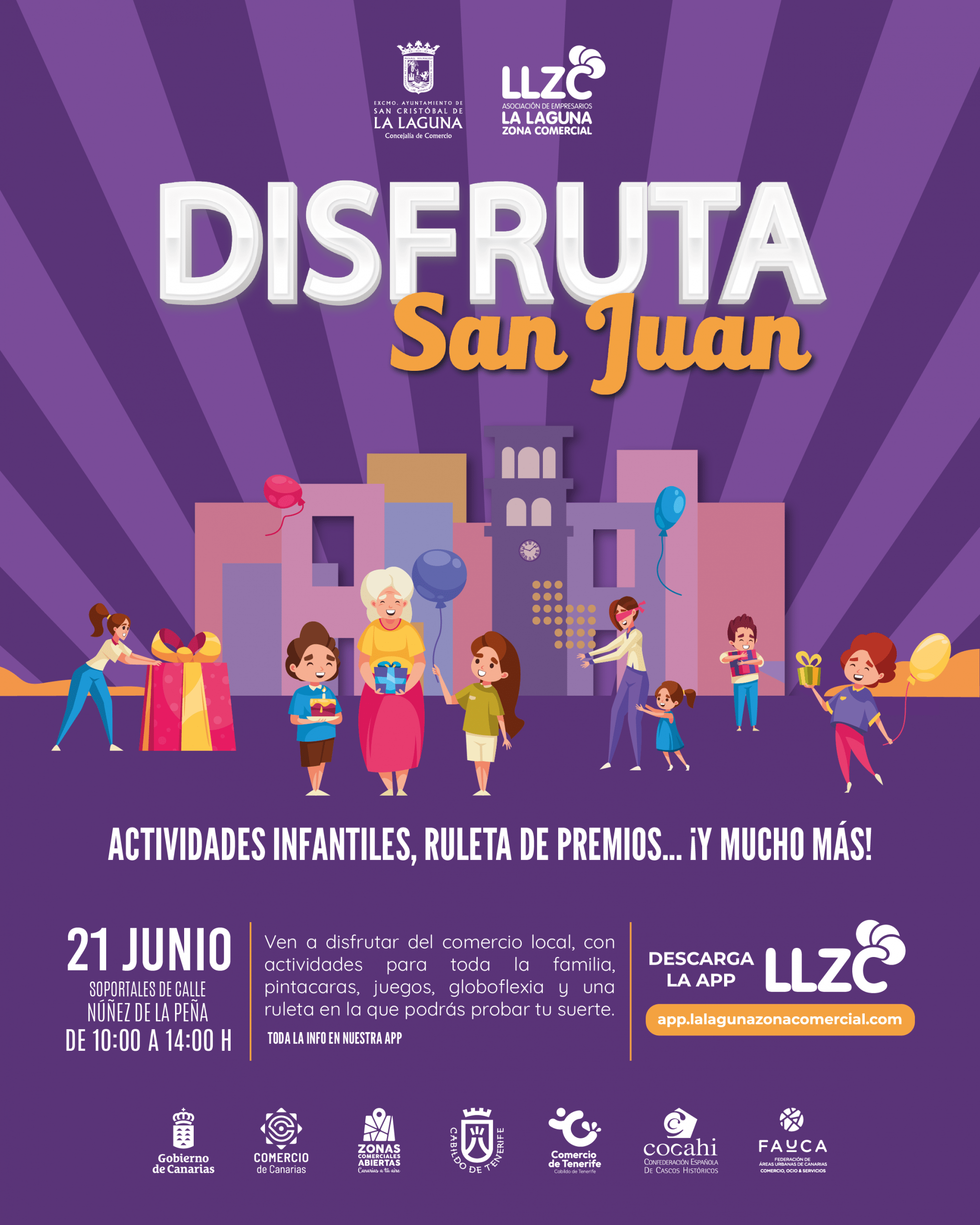 El Ayuntamiento de La Laguna, a través del área de Comercio, vuelve a apostar por el comercio local como motor económico y social con la celebración de ‘Disfruta San Juan’, una jornada que este sábado 21 de junio, de 10:00 a 14:00 horas, llenará la calle Núñez de la Peña y su entorno de color, actividades y alegría. Las propuestas se concentrarán en los soportales de esta calle y se extenderán de forma itinerante por las vías aledañas, donde diferentes artistas recorrerán los comercios realizando globoflexia y trucos de magia, creando un ambiente festivo que invita a disfrutar del comercio local en familia.