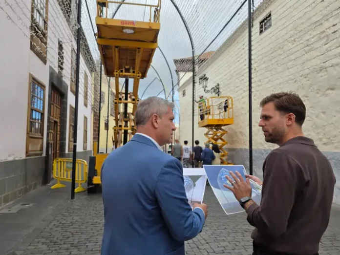 En La Laguna se trabaja esta semana en el montaje del gran arco luminoso de la calle Obispo Rey Redondo (La Carrera), una de las estructuras más emblemáticas del alumbrado navideño del municipio. El concejal de Servicios Municipales, Fran Hernández, ha supervisado los avances junto al equipo técnico y a la empresa responsable de la instalación, que se desarrolla por fases para garantizar la seguridad y el ajuste final de iluminación.