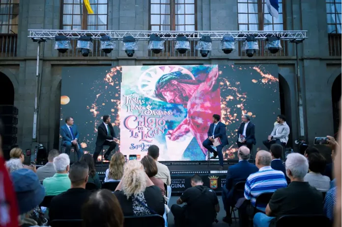 La fachada principal del Ayuntamiento de La Laguna ha albergado este miércoles, 27 de agosto, la presentación del cartel y el programa oficial del Santísimo Cristo 2025. La agenda de esta edición estará compuesta por más de medio centenar de actos culturales, religiosos, deportivos y populares, que se desplegarán en la ciudad entre los días 4 y 21 de septiembre.