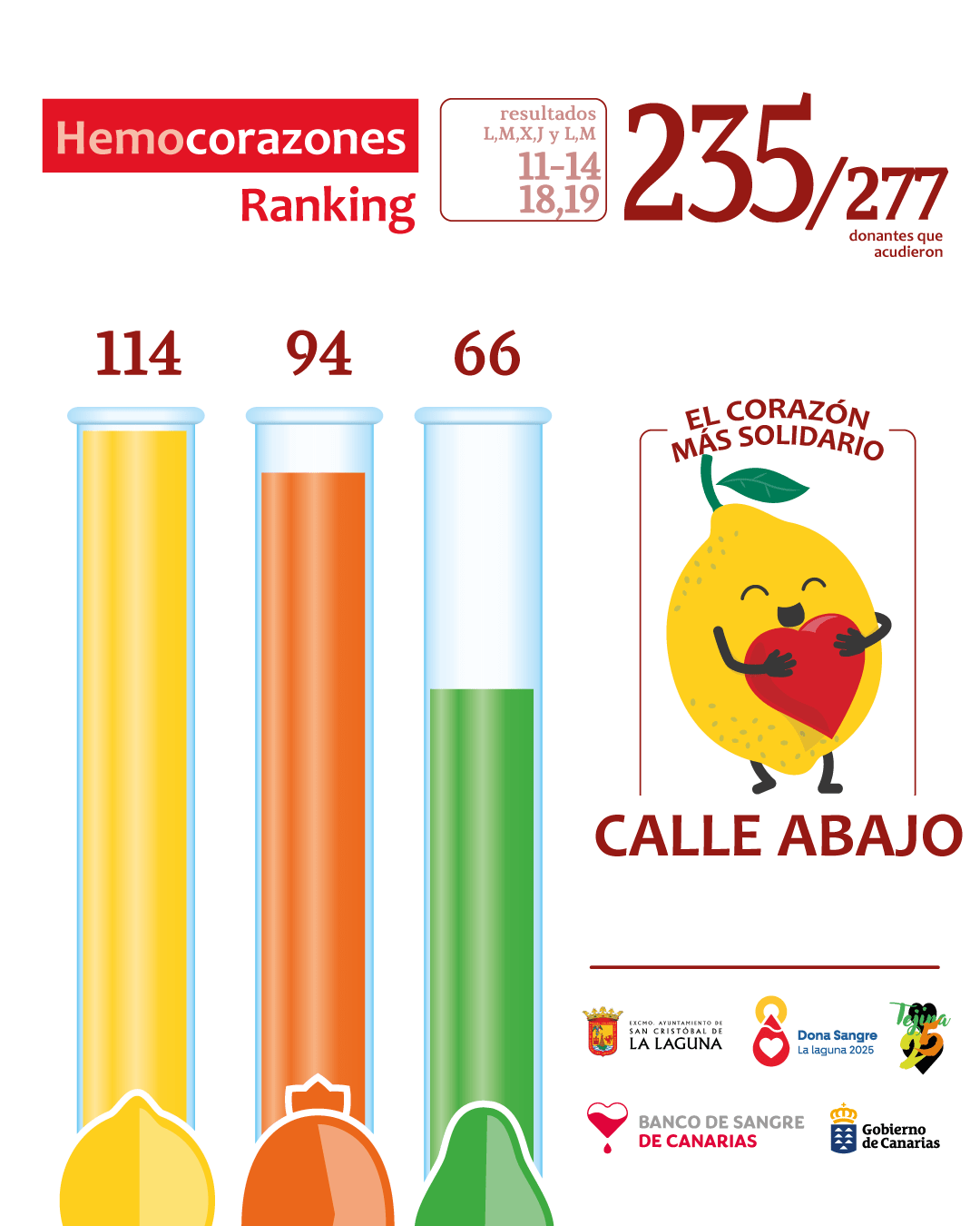 El Ayuntamiento de La Laguna ha querido felicitar y reconocer la solidaridad del pueblo de Tejina, que se ha volcado un año más con la campaña de donación de sangre ‘Néctar de la vida’, celebrada en el marco de las fiestas de San Bartolomé. En esta undécima edición, la unidad móvil instalada en la plaza de El Ramal registró un total de 277 donaciones, lo que supone casi medio centenar más que en 2024. La calle Abajo volvió a alzarse como la más solidaria, con 114 extracciones, seguida de la calle Arriba, con 94, y El Pico, con 66.