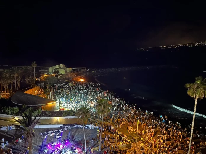 La Playa de Martiánez superó todas las expectativas de aforo, llenándose de asistentes que no quisieron perderse esta tradición. A las 21:00 horas, el grupo ‘Voces en la Distancia’ amenizó la velada con un tributo a los años 80, creando un ambiente festivo y lleno de nostalgia. Posteriormente el DJ Danny Méndez animó la fiestas hasta las 2 de la mañana donde permanecieron sobre todo los jóvenes ya de vacaciones escolares.