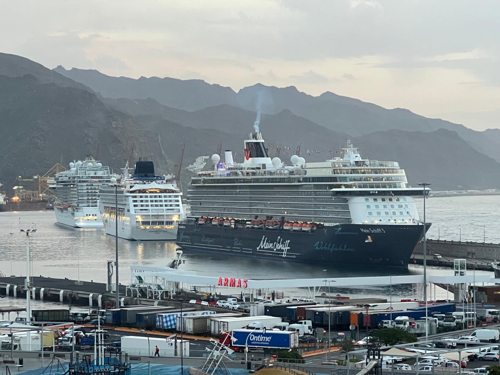 El puerto de Santa Cruz, a tope de cruceros. Otros esperan fuera.