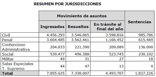 La jurisdicción Penal registró 887.573 nuevos asuntos, un 2,6 % más que un año antes. Se resolvieron 898.273 asuntos, un 2,1 % más, y quedaron en trámite 1.119.714, un 7,6 % más.
