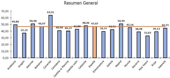 En cuanto a la tasa de congestión (cociente donde el numerador está formado por la suma de los asuntos pendientes al inicio del periodo y los registrados en ese periodo, y el denominador son los asuntos resueltos en ese periodo; mejor cuanto más baja) , la de Canarias fue 3,28, la sexta más alta del país, 0,08 décimas por debajo de la media nacional (3,36).