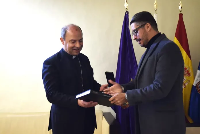 El alcalde de La Laguna, Luis Yeray Gutiérrez, ha recibido este miércoles al obispo electo de Tenerife, Eloy Santiago, en lo que ha sido el primer encuentro personal de ambos desde que se hiciera pública la elección del nuevo titular de la Diócesis Nivariense. La recepción se ha producido en el marco de una nueva reunión de coordinación del dispositivo que el Obispado está preparando con motivo de la ordenación episcopal y toma de posesión canónica, que se celebrará el jueves 1 de mayo en la Catedral de La Laguna.