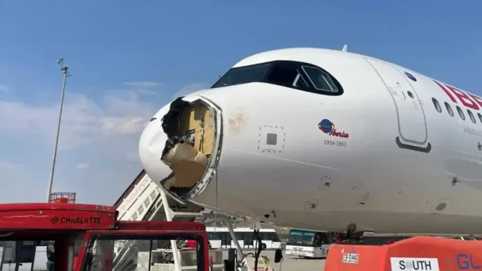 El incidente ocurrió pocos minutos después del despegue desde la terminal en la tarde del 3 de agosto. Se trata de un Airbus A321 que, tras abandonar la pista, alcanzó una velocidad suficiente en ascenso cuando colisionó con un ave. El impacto arrancó un fragmento de la cubierta frontal del morro, comprometiendo sistemas electrónicos críticos como el radar meteorológico, lo que obligó de inmediato a la tripulación a solicitar permiso para volver a Barajas.