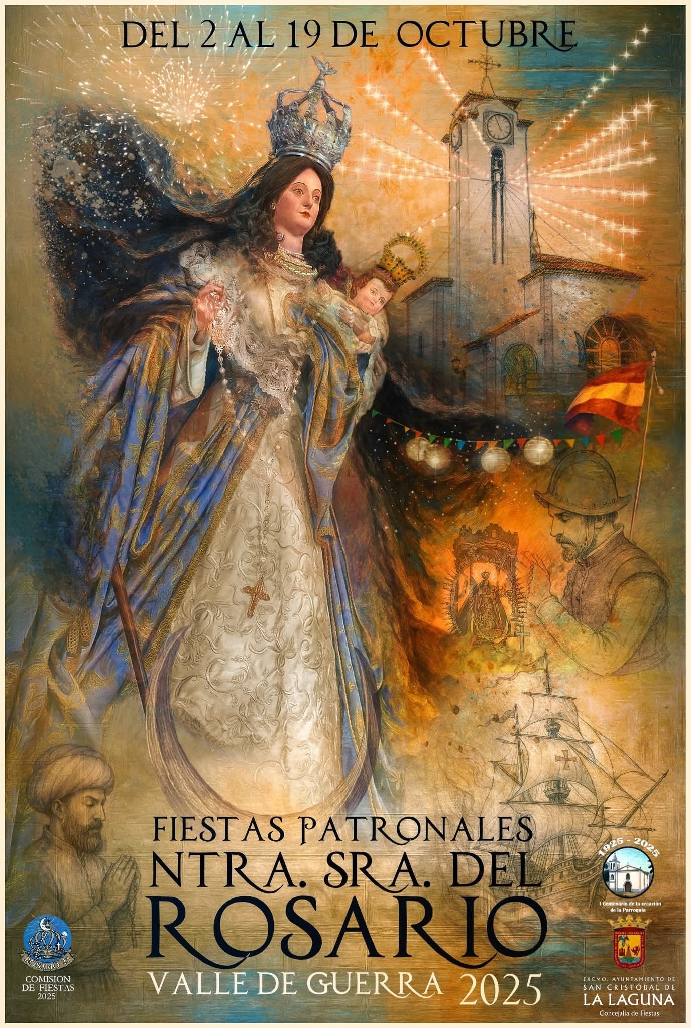 Según explica la autora, la parte histórica está reflejada en la parte inferior del cartel, con las antiguas ermitas y la actual parroquia de Nuestra Señora del Rosario. Aparecen los personajes a caballo, que representan las antiguas milicias que custodiaban la Virgen en las procesiones, y la pandorga: los campesinos que acompañaban a la imagen con sus linternas chinas. “Todo este contexto histórico lo unifiqué con un paisaje agrícola como representación de las fincas y de los trabajos que allí se hacían”, asegura Alicia Díaz Barbuzano.